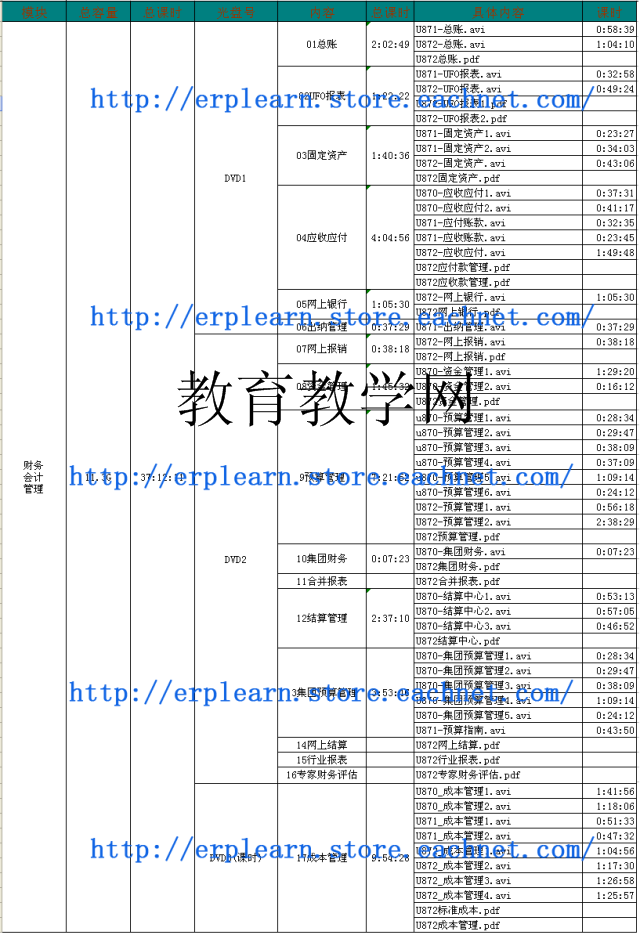 这款视频共有52.8G,视频资料是统一的AVI格式,时长达170个小时,共有20张DVD光碟,购全套附送87X培训文档1DVD,另送用友实施顾问资料光盘1DVD,合计22DVD!